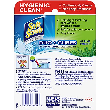 • 4 Count, Alpine Fresh Scent, Soft Scrub Duo Cubes Toilet Bowl Cubes, Helps Fight Toilet Ring, Hard Water Limescale, Safe For Toilet Components, Easy To Use, Cleans Up To 4 Weeks