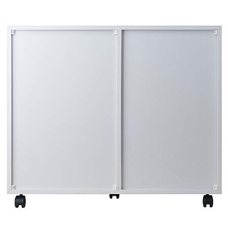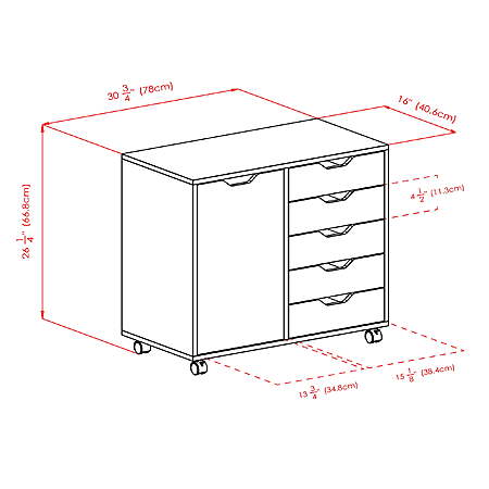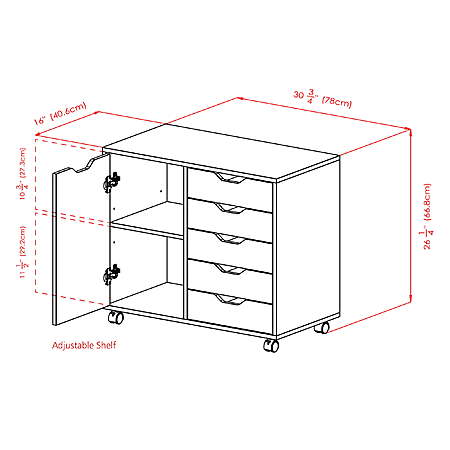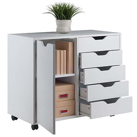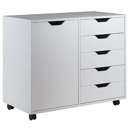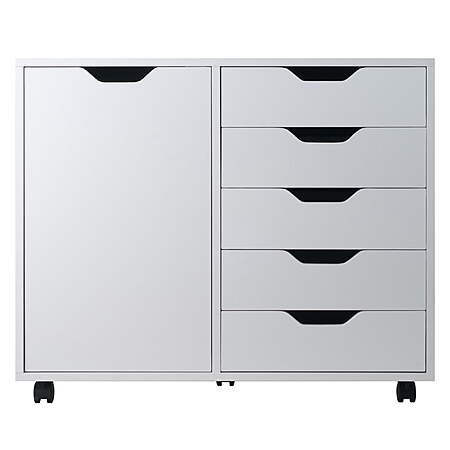 Product Description: | The Winsome Halifax 2-Section Storage Mobile Cabinet is ideal for all your organizational needs. With its clean, simple design, and convenient cut-out handles, you can use it anywhere. With a multitude of drawers, it is the perfect organizer for your knitting, sewing, or craft supplies. Or use it in the bedroom to expand your storage for accessories and eliminate the appearance of clutter. Rejuvenate your home-office as this unit is well-suited for documents and files, and plenty of space for keeping charging cables and office accessories neat and organized. With 5 easy-glide drawers at 13.23”W x 11.73”D x 2.56”H, that provide ample storage for sorting items into 1 of 5 drawers. The side cabinet has a spacious interior of 13.70"W x 14.76"D x 22.83"H, with an adjustable shelf making it great for linens. The shelf is removable but when in place has three height positions, allowing you to adjust it and make adaptable depending on your storage needs. This unit also features five wheels so you can roll with ease, two of which lock to keep unit securely in place. An easy to clean, sturdy composite wood construction finished in a crisp, white that makes this simple, contemporary design certain to brighten any space. Combine this unit with other cabinets from the Winsome's Halifax collection to create infinite storage options (each sold separately). Ships in one box with the hardware necessary for assembly. Freestanding mobile cabinet 5-easy glide drawers and storage cabinet with shelf Halifax collection by Winsome Clean white finish Contemporary style Constructed from composite wood Overall dimensions: 30.71”W x 15.98”D x 26.30”H Drawers (interior) dimensions: 13.23”W x 11.73”D x 2.56”H Storage cabinet (interior) dimensions: 13.70”W x 14.76”D x 22.83”H Adjustable cabinet shelf Clearance underneath cabinet: 2.16"H Cut-out handles on door and drawers 5-Wheels (2 with locking mechanism) Static weight capacity: top 35lbs, drawers 12lbs ea., cabinet 25lbs, shelf 25lbs Net weight: 58lbs Ships in 1 box Box dimensions: 36”L x 20.50”W x 9”H Shipping weight: 65lbs Assembly required Recommended use: indoor-household Model #10630 |