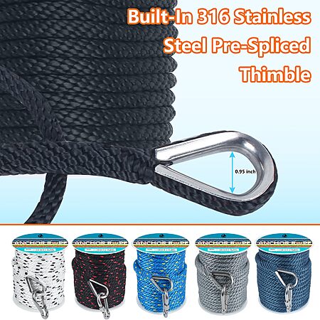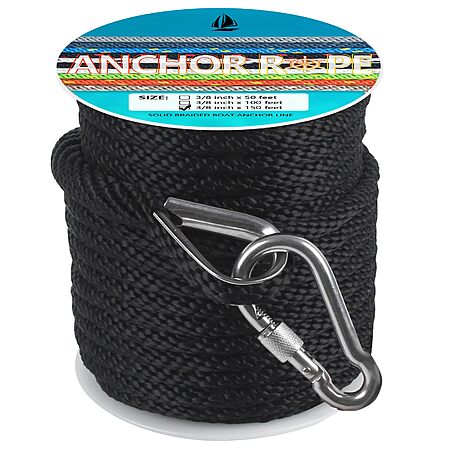 3/8 Inch 150 FT Anchor Rope, Solid Braid MFP Boat Line With 316 Stainless Steel Thimble and Snap Hook - Black - $19.92 FS w/ Prime