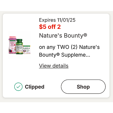 Walgreens [walgreens.com] has select Nature's Bounty supplements buy 1 get 1 free + $5 off 2. Get 2x,