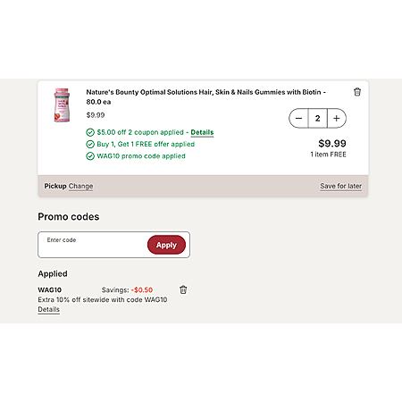 Final price should be $9.99 (for 2 with BOGO) - $5 (from coupon) - $0.50 (WAG10) = $4.50.
