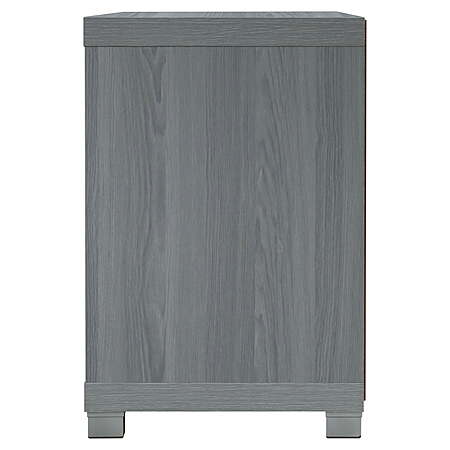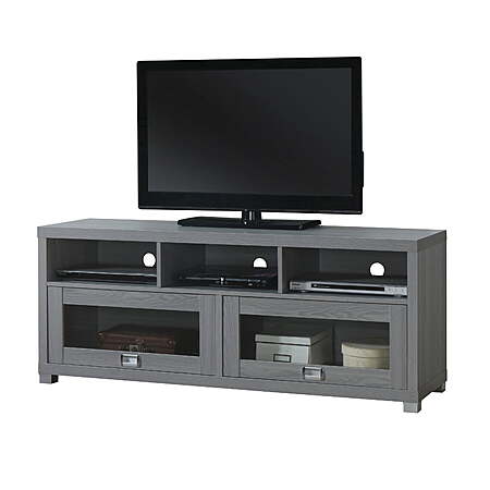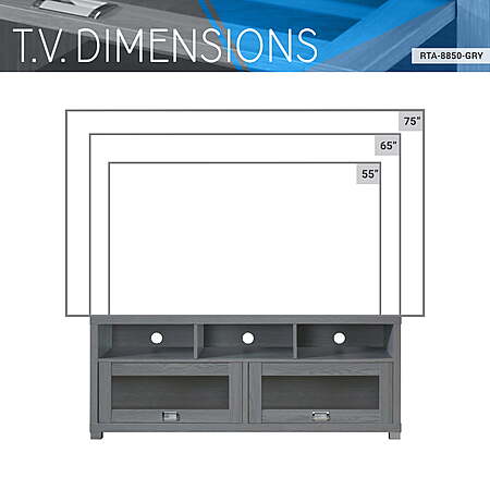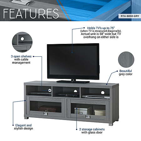 This contemporary Techni Mobili Durbin TV Cabinet is designed to fit any bedroom, living or family room. It includes two glass doors with storage space and three shelves for accessory storage. The Techni Mobili TV Cabinet is made of compressed wood that is more resistant to scratches. Measure the width of your TV and the width of the legs to see how it will fit across the top of this 57.6” wide TV stand. This TV stand can support a TV that overhangs on the sides. Fits flat screen TVs up to 75" with a maximum weight of 110 lbs Each open shelf holds up to 40 lbs Each cabinet holds up to 60 lbs Contemporary styling 2 glass doors with 1 shelf for audio or gaming components 3 shelves for additional accessories Back panel openings for cord management Made of engineered wood with laminate surface that is scratch-resistant and easy to wipe clean Gray wood finish 2-years limited warranty Assembly required Dimensions: 57.5"L x 15.5"W x 23.25"H Model# RTA-8850-GRY