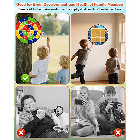 - Versatile Gameplay for Kids and Adults - This 26" double-sided dart board with 20 sticky balls adapts to kids and adults. Customizable rules foster creativity and inclusivity, making it ideal for teamwork games that combine physical activity and mental engagement. Enjoyable for friends and family. Package includesss: 1x 26" dart board, 20 sticky balls (1.34-inch, 4 colors: blue, green, yellow, red), and 1 hook.