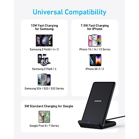 Model: Anker Wireless Charger, 313 Wireless Charger (Stand), Qi-Certified for iPhone 12, 12 Pro Max, SE, 11, 11 Pro, 11 Pro Max, XR, XS Max, 10W Fast-Charging Galaxy S20, S10 (No AC Adapter)