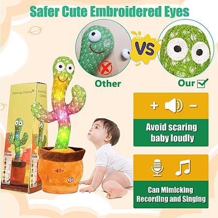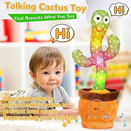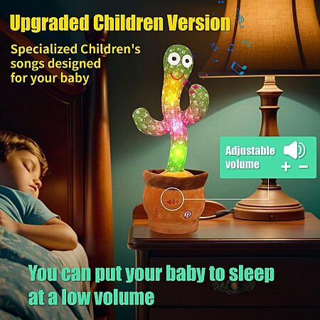 - 【VOLUME ADJUSTABLE TALKING CACTUS TOY】:cactus baby toy has the ability of dancing, talking, repeat what you say, recording, glowing, adjust the volume. Whether your child wants to boogie with upbeat tunes or wind down with soft melodies, this toy has the perfect pitch. With just a press and hold of the music button, you can effortlessly find the right volume for any moment. Plus, singing cactus comes preloaded with catchy children's songs that will have your little ones singing along.