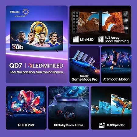 Model: Hisense 85" Class QD7 Series Mini-LED 4K UHD Smart Fire TV (85QD7QF, 2025 Model) - QLED, Native 144hz, HDR10+, Dolby Vision, Dolby Atmos, Game Mode Pro, ALLM, Alexa Built in with Voice Remote, Black