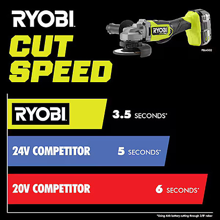The RYOBI 18V ONE+ HP Brushless line of products is redefining power and performance by introducing the next generation RYOBI 18V ONE+ HP Brushless 4-1/2 in. Angle Grinder/Cut-Off Tool. Delivering up to 11 amps of corded performance and up to 210 cuts per charge, this Brushless Angle Grinder will complete your next project with efficiency and ease. Plus, the superior heat management system extends the life and durability of your tool, helping you complete even the most demanding applications. The upgraded foot angle allows for better and easier flush cutting applications while The tool-free guard adjustment makes switching wheels out quick and easy for versatile grinding and cutting applications. The 3-position side handle along with the paddle switch provide ultimate comfort, control, and versatility. Best of all, it is part of the RYOBI ONE+ system where any 18V ONE+ battery works with any 18V ONE+ product. This Brushless ONE+ HP 4-1/2 in. Angle Grinder/Cut-Off Tool is backed by the RYOBI 3-Year Manufacturer’s Warranty and includes the PBLAG02 18V ONE+ HP Brushless 4-1/2 in. Angle Grinder/Cut-Off Tool, (1) PBP1104 18V 4Ah Lithium HIGH PERFORMANCE EDGE Battery, Fast Charger, Cutting Guard, Side Handle, Spanner Wrench, Grinding Wheel, Cutting Wheel and Operator's Manuals.