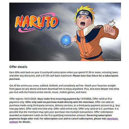 Chase Offers 90% Cash Back on Crunchyroll Subscription $0.8 for 1 month