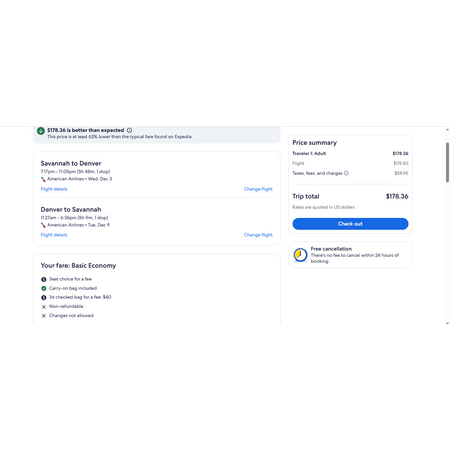 American and Expedia have round trip airfares travelling to and from Savannah GA (SAV) and Denver (DEN) for $179, making 1 stop both ways. These are basic economy fares. On American, you may have a personal item and a carry on bag. There is no seat selection and no change. If you are travelling with children, you will be seated together as per AA's policy.
