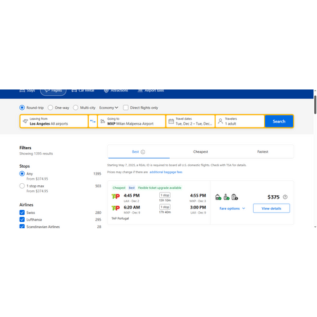 TAP Air Portugal via Booking.com have round trip airfares travelling from Los Angeles (LAX) to Milan Italy (MXP) for $375, making 1 stop in Lisbon both ways for 1-3 hours. These are economy lite fares that allow a personal item and a carry-on bag. There is no seat selection and no change.