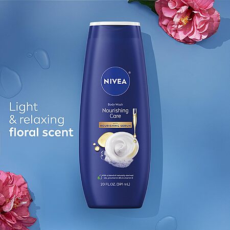- Give your skin the care it deserves with Nivea Nourishing Care Body Wash. Frequent showers and hot water can strip your skin of essential oils, which can lead to moisture loss. Nivea Nourishing Care Body Wash for dry skin provides nourishing moisture for thy-looking skin that feels soft and smooth. This scented body wash with nourishing serum is enriched with a unique blend of plant-derived oils, essential skin lipids and vitamins that work together to care for your skin while gently cleansing. Enjoy a pleasant floral aroma in your shower with this delightfully scented body wash. The creamy lather leaves skin amazingly soft and pampered, and can also be used as an alternative to shaving cream. This body wash is ideal for everyday use, and is free of Parabens and Microplastic Particles. A nourishing body wash is a key part of a skincare routine, and pairs well with Nivea Body Lotion as part of a daily skin care regimen. To use, apply Nivea Nourishing Body Wash onto cleansing pouf, massage the creamy lather onto your body, and rinse off for a refreshed skin feel. Nivea is a trusted leader in the field of skin care products, with more than 130 years of expertise. One 20 fluid ounce bottle of Nivea Nourishing Care Body Wash; This lightly scented body wash has a pleasant, relaxing floral scent that brings a delightful aroma to your shower; Nivea Nourishing Care Body Wash is enriched with a unique blend of plant-derived oils, essential skin lipids and vitamins; The creamy lather of this body wash is also a great alternative to shaving soap or shaving cream; To use, apply Nivea body wash onto cleansing pouf, massage onto your body, and rinse off for a nourished skin feel;