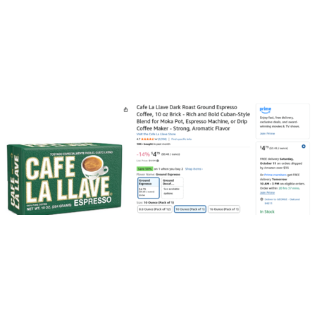 2 × 10-Oz Cafe La Llave Dark Roast Ground Espresso Coffee, ($3.35 each) at Amazon