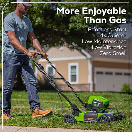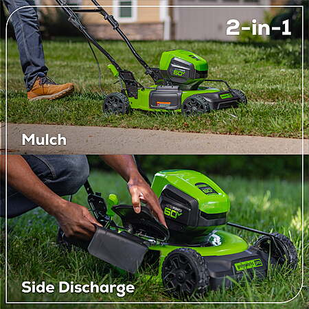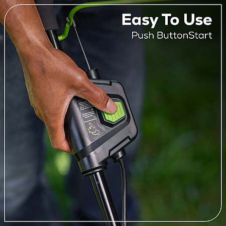 Product Description: | Experience the next level of lawn care with the Greenworks 60V 19” Cordless Battery Push Lawn Mower. Tackle tall grass effortlessly with its heavy-duty stamped steel 19” deck size. Say goodbye to cord yanking with the convenient push-button start, making mowing a hassle-free task. Its 2-in-1 design allows for easy mulching and side discharge, giving you versatile options for maintaining your lawn. Equipped with intelligent brushless motor technology, this mower delivers 2x more torque, increased power, extended runtimes, and quiet operation while ensuring an extended motor life. Utilize the power of the 5.0Ah battery that fuels not just this mower but also over 75 other 60V products, offering convenience and efficiency for a range of yard tasks. Say hello to convenience and goodbye to hassle with the Greenworks 60V 19” Cordless Battery Push Lawn Mower. Zero gas smell. Zero pull cords. Zero maintenance. Zero pollution breathed. Zero time wasted. Greenworks 60V 19" Cordless Battery Push Lawn Mower: 19" Deck Size - Heavy-duty stamped steel plows through the tallest grass Push Button Start - Press and mow, no more cord yanking 2-in-1 Design - for easy mulching and side discharge Intelligent Brushless Motor Technology - 2x more torque, more power, longer runtimes, quiet operation, and extended motor life Battery Powers 75+ 60V Products - One battery to mow, blow, cut, trim, cultivate, and more |