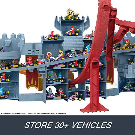 Race and stunt through the Hot Wheels Mario Kart Bowser's Castle Track Set with a 1:64 scale Kamek. This massive playset features interactive racing with loops, a slam launcher and a rogue Bullet Bill who swoops through, trying to knock Kamek off track. There's room to store more than 30 vehicles when they're not in play, put them on display A first-appearance Kamek is included; additional vehicles sold separately. The set also folds for easy storage.