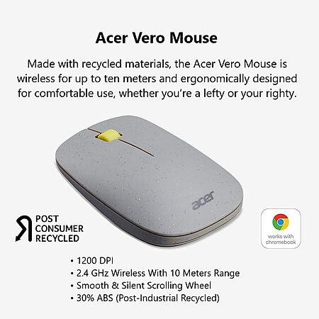 Amazon.com has Acer Vero 3 Button Mouse | 2.4GHz Wireless | 1200DPI | Made with Post-Consumer Recycled (PCR) Material | Certified Works with Chromebook | Gray on sale for $14.99
