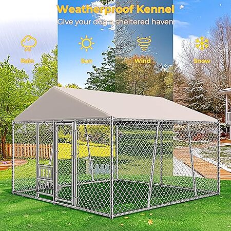 10 x 10FT Large Outdoor Dog Kennel with Bowls, Dog Kennel Outside with Waterproof Cover Roof, Galvanized Heavy Duty Chain Link Dog Runs Cage Playpen for Outside with $215.99