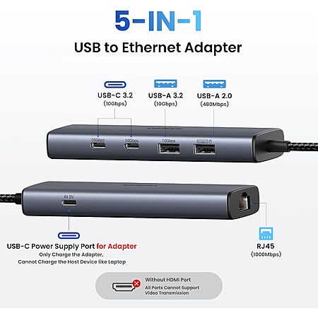 Model: UGREEN USB to Ethernet Adapter, 5 in 1 USB Hub with Ethernet with 2* USB-C 3.2 (10Gbps) + 1*USB-A 3.2/1*USB-A 2.0/Gigabit RJ45, USB to Network LAN Internet Dongle for Laptop, MacBook Pro/Air, XPS