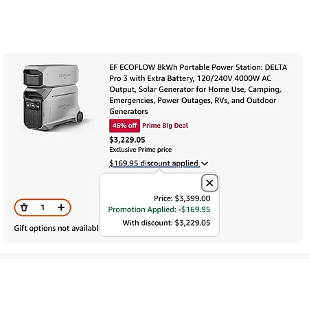 Ecoflow BIG PRIME DAY deal price for Amazon Prime members has Ecoflow Delta PRO 3 WITH Delta Pro 3 Extra Battery (8kWh total capacity) for $3399 - 5% use Ecoflow Prime Big Day code