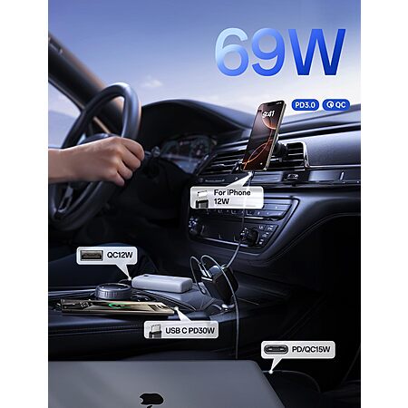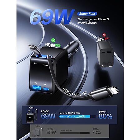 69W EWITGO Retractable Fast Charging Car Charger w/ 4" Cables & 2 Ports $16.99 + Free Shipping w/ Prime or on $35+