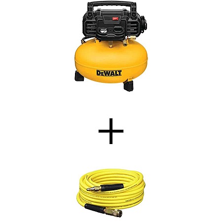 The DEWALT DWFP55126 6 Gal. Air Compressor is designed with a high efficiency motor for easy start up in cold weather or extension cord applications. This compressor has 2 universal couplers to easily support 2 users. The DWFP55126 features a long life oil-free pump for maintenance-free operation. The DEWALT 50 ft. Air Hose DWFP1450D is designed to withstand the rigors of your job site.