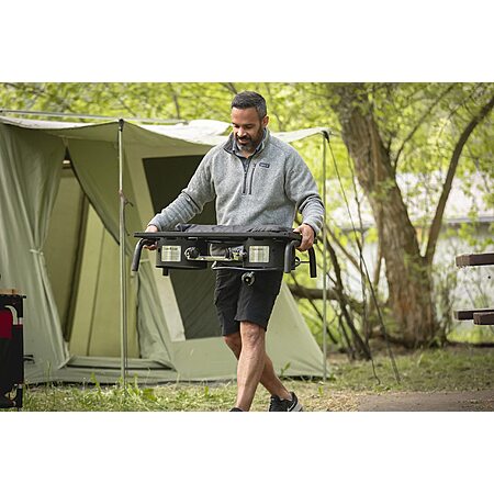 Model: Camp Chef Explorer, Two Burner Stove, Two 30,000 BTU's cast-aluminum burners, Cooking Dimensions: 14 in. x 32 in