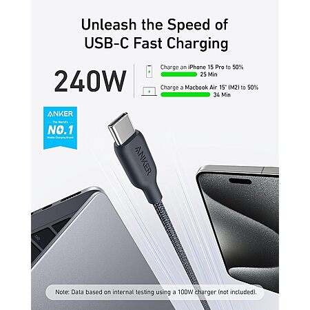 Model: Anker USB C to USB C Cable (240W,10ft), Bio-Braided USB C Charger Cable Fast Charge for iPhone15/15Pro/15Plus/15ProMax, iPad Pro 2020, iPad Air 4, Samsung Galaxy S23+/S23 Ultra
