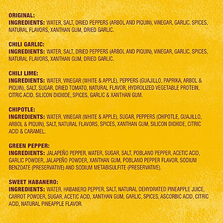 Includes: Original, Chipotle, Chili Garlic, Green Pepper, Chili Lime & Sweet Habanero