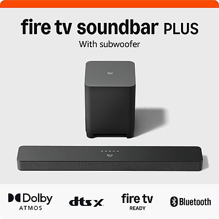 Fire TV Soundbar Plus with subwoofer – Heighten sound and your senses with a 3.1 soundbar and bass you can feel. Featuring crisp dialogue, Dolby Atmos, and DTS:X.