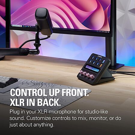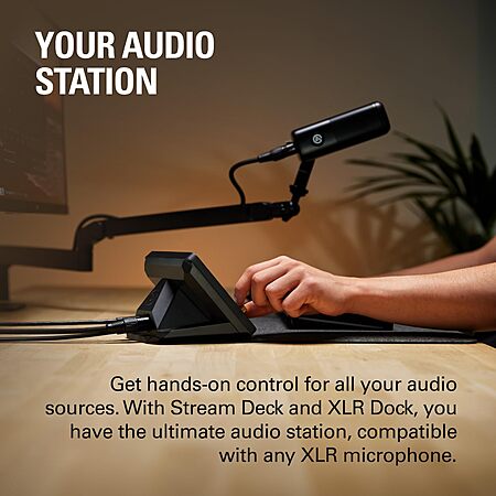 Stream Deck + with XLR Dock becomes the ultimate audio station; In the back, plug in your XLR microphone for studio-like sound; Up front, customize controls to mix, monitor, or do just about anything. It's all your audio in one place