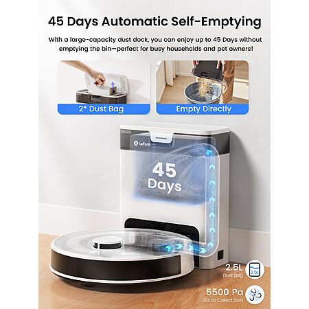 Prime: Lefant LiDAR Robot Vacuum and Mop, 45-Day Self-Emptying, 190° PSD Obstacle Avoidance, 5500Pa Strong Suction $199.99