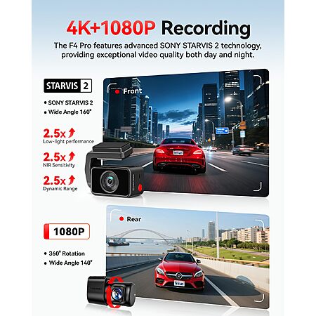 Prime: REDTIGER F4 Pro 4K Dash Cam Front and Rear: STARVIS 2 Sensor, 128GB Card, 2.2" Touch Screen $89.99