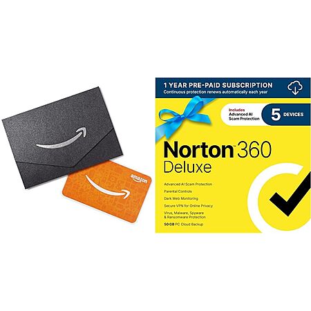 Norton 360 Deluxe, Antivirus Software for 5 Devices + $10 Amazon Gift Card - Includes AI Scam Protection, VPN, Dark Web Monitoring & PC Cloud Backup [Download] $20