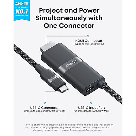 AnkerDirect via Amazon [amazon.com] has 3' Anker Nano USB C to HDMI Cable Adapter w/ 140W PD Fast Charging Port (Black) for $18.99. Free Shipping w/ Prime or on $35+