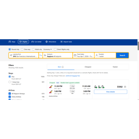 RT San Francisco to Hokkaido Sapporo Japan $592 Airfares on Asiana Airlines (Travel Cherry Blossom Season April 2026)