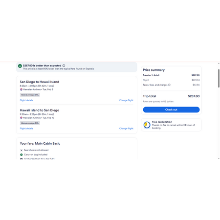 Hawaiian Airlines/Alaska Airlines and Expedia have round trip airfares travelling to and from San Diego (SAN) to Hilo Hawaii Island (ITO) for $288, making 1 stop both ways. These are basic economy fares that allow a personal item and a carry-on bag. There is no seat selection and no change.