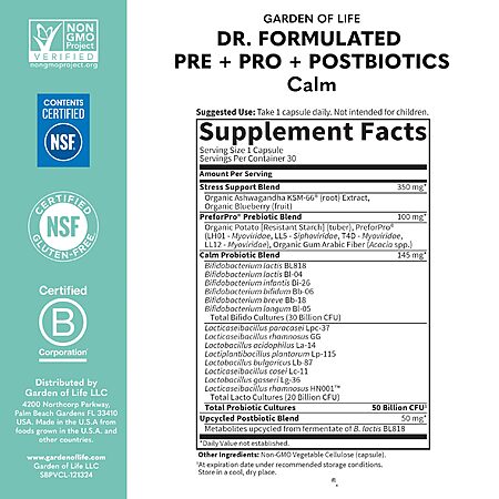 Model: Garden of Life Dr Formulated Calm Daily 3-in-1 Complete Probiotics, Prebiotics & Postbiotics with Ashwagandha - PRE + PRO + POSTBIOTIC Supplement for Immune, Digestive & Mood Support - 30 Day Supply