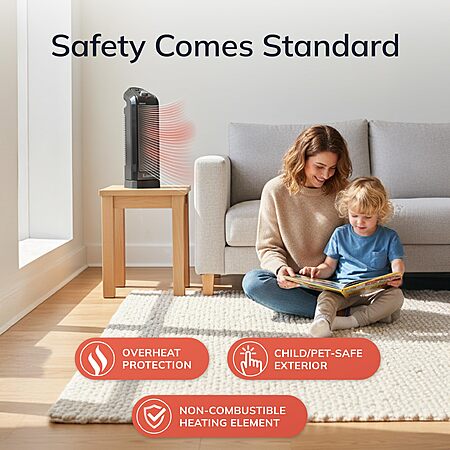 At 15.7H x 6L x 5W inches, this space heater easily fits on a table, desk, counter top or nightstand and is ideal for warming up the bedroom, home office, kitchen or anywhere warmth is wanted to save on whole-house heating costs.