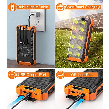 Super Large Capacity : With 36000mAh premium Li-polymer battery, this solar power bank can charge your devices multiple times. It can be recharged via adapter and solar power, free your worries of poweroff. Equipped with smart protection IC chip, it guarantees charging safety intelligently