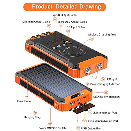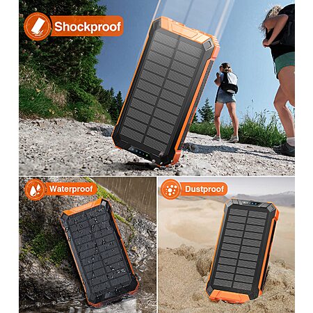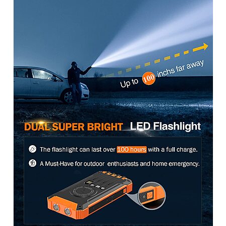 Sturdy&Durable Design for Outdoor : This solar battery pack is well made to be Waterproof/Shockproof/Dust-proof, which can withstand the harsh environment outdoors. It's equipped with Dual super bright LED lights, a Must-Have tool for outdoor activities and home emergencies