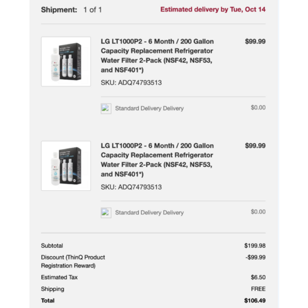 Purchase an eligible LG Water Filter and receive an extra 50% off the pre-tax sale price with code THINQ50. Available on LG.com from October 1, 2024 – December 31, 2025. To receive the additional 50% off of the pre-tax sale price, log in to LG.com and enter code THINQ50 during online checkout. Prices and offers are non-redeemable for cash and non-transferable. Availability, prices, and terms of offer are subject to change without notice. Eligible Refrigerator Filters: LT1000P, LT1000P2, LT1000P3, LT1000P4, LT800P, LT800P2, LT800P3, LT800P4, LT700P, LT700P2, LT700P3, LT700P4, LT600P, LT600P3, LT500P, LT500P3, LT1000P & LT120F, LT800P & LT120F, LT700P & LT120F