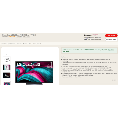 LG Partner Store has the 48" Inch Class LG OLED evo AI C5 4K Smart TV 2025 [lg.com] for $809.00 - 10% with promo code EARLYSAVINGS in your cart = $728.10 + Tax. Shipping is free.
