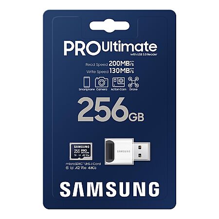 Model: Samsung PRO Ultimate microSD Memory Card + Adapter, 256GB microSDXC, Up to 200 MB/s, 4K UHD, UHS-I, Class 10, U3,V30, A2 for GoPRO Action Cam, DJI Drone, Gaming, Phones, Tablets, MB-MY256SA/AM