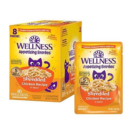 Wellness Appetizing Entrées Shredded Adult Wet Cat Food, Natural, Protein-Rich, Grain Free, 1.4 Ounce Pouch, 8 Pack (Chicken Recipe) $7.14