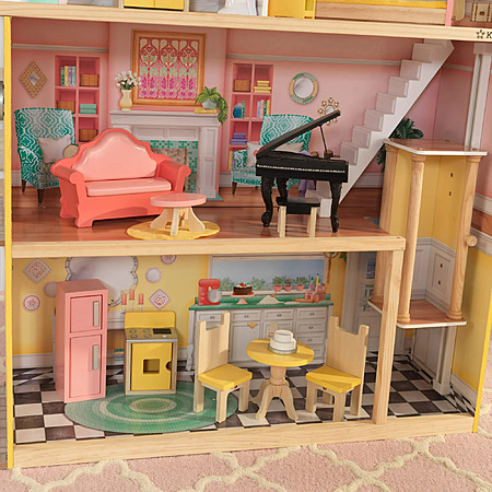 Product Description: | Welcome home to the cheerful and cozy KidKraft Lola Mansion Dollhouse! Standing over four feet tall and featuring four levels of play, this wooden dollhouse is spacious enough to house big dreams and big play! There are six rooms and an expansive carport to explore. This dollhouse is for 12" toy dolls and includes six rooms, an expansive carport, 30 pieces of doll furniture and other doll accessories, a working elevator, a staircase, an attic, an easel with a sticky notepad. Some pieces even have light and sound features (batteries are included). Each room of this KidKraft Wooden Dollhouse is full of bright colors and lifelike graphics for hours of storytelling and role-playing for your child! And with our innovative EZ Kraft Assembly™ technology, there's easy-to-assemble parts with fewer hardware, so there's less time building so your little ones can spend more time playing! Suitable for 3 years and older. Fun and interactive indoor dollhouse for kids to help spark creativity and learning; assembled product height is over 4 feet tall (52") Designed with four levels, six rooms, a large patio with lights and railing detail, and a spacious carport (doll vehicles not included) Expansive 30-piece accessory set with lights and sounds; includes a staircase, full kitchen and dining set, bedroom set, and more Dollhouse mansion includes bright colors and detailed graphics, including a vanity dresser, a cozy window nook, and a grand fireplace Working elevator glides to the second floor, and the second-floor staircase offers access to the third floor Sticky notepad-sized easel for drawing or writing notes Sturdy wood construction with premium, recyclable materials for long-lasting play |