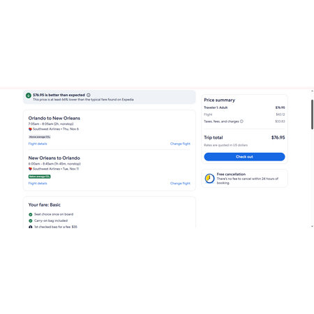 Southwest Airlines and Expedia have round trip airfares travelling to and from Orlando FL (MCO) and New Orleans (MSY) for $77, nonstop. These are basic economy fares, a restricted-type fare that allows a personal item and a carry-on bag. There is no seat selection and no more free checked bags on Southwest.
