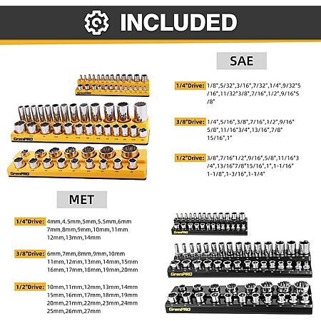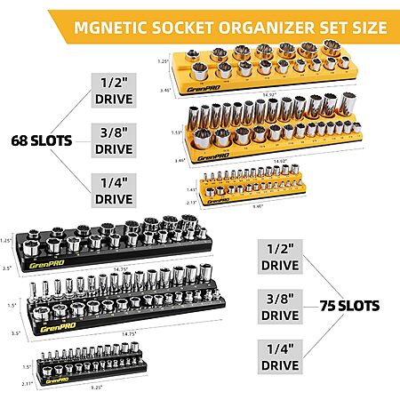 About this item- 【Magnetic Socket Organizer Set】: Magnetic kit includes 3 black (1/4",3/8",1/2") metric magnetic socket organizers and 3 yellow (1/4",3/8",1/2") SAE magnetic slot organizers.Socket organizer holds multiple sizes of receptacles, including metric and SAE sizes. Magnetic socket tray holds up to 143 metric and SAE receptacles.
