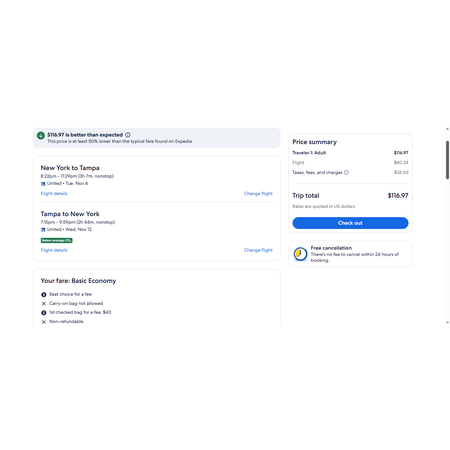 United Airlines, JetBlue and Expedia have round airfares travelling to and from New Jersey (EWR) and Tampa FL (TPA) for $117, nonstop. These are basic economy fares. On United you may have a personal item. On Jetblue you may have a personal item and a carry-on bag. There is no seat selection and no change. If you are travelling with children, you will be seated together.