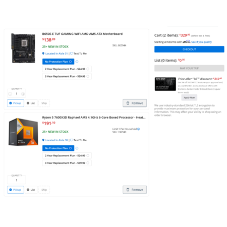 Micro Center (In-Store Pickup only): 7600x3d + ASUS B650E-E TUF $329.99