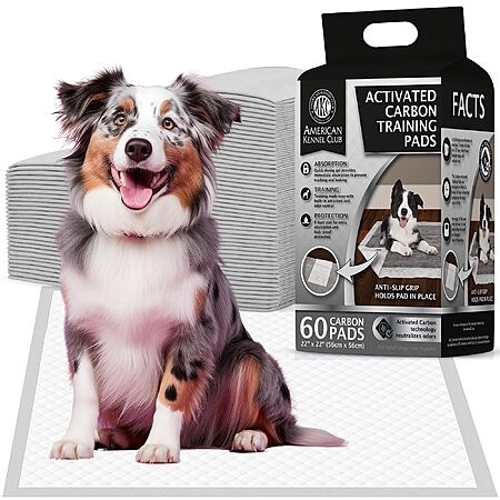 American Kennel Club Charcoal Puppy Training Pads, with Anti-Slip Adhesive Backing, Quick Dry Gel and Activated Carbon Odor Control (Charcoal, 22" x 22"- Pack of 60) $10.48, Amazon