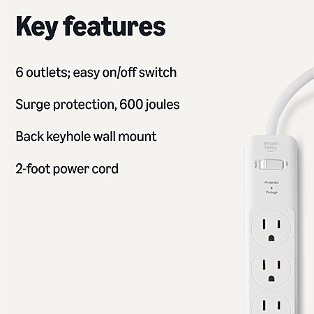 Model: Amazon Basics Rectangle 6-Outlet, 600 Joule Surge Protector Power Strip, 2ft, Small, White, 2-Pack